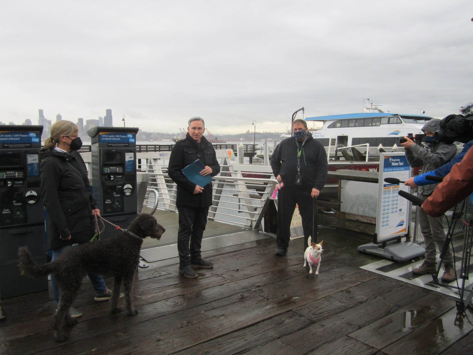 King County Executive Dow Constantine shared the good news in West Seattle at the Seacrest Ferry Dock, flanked by two dogs, Juneau and KC Metro. “With fast service and amazing views, the only thing missing from the Water Taxi was our furry friends. Now we’re welcoming well-behaved cats, dogs, and humans to come aboard and cross Elliot Bay,” he said. “The Water Taxi remains a vital connection to downtown Seattle, especially now while the repairs to the West Seattle Bridge are still underway. Whether you’re on a bus or the Water Taxi, heading to the off-leash park or the veterinarian, King County Metro is ready to get pet parents and their floofs wherever they need to go.”