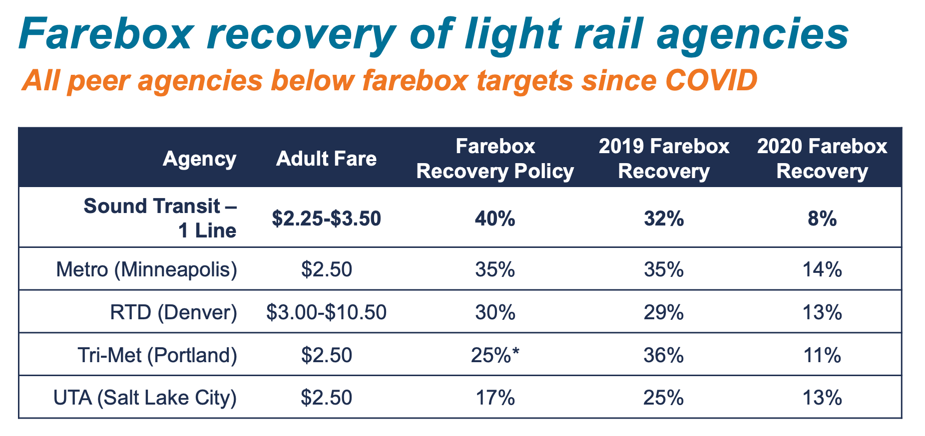 Farebox recovery on the 1 Line (Link light rail) reached 10% in 2021, which was better than 2020’s 8%, but that’s still a far cry from 2017’s 40% farebox recovery rate — the agency’s long-standing target for light rail. Agency officials don’t expect to see that level of farebox recovery in the future for a variety of reasons, such as high levels of fare evasion (which the agency estimated at 42% in January), lower overall ridership compared to service levels, and higher operating costs. These factors have all worked against reaching target farebox recovery. Peer agencies have seen higher farebox recovery on light rail systems than Sound Transit, which the agency seemed to suggest was the result of having temporarily suspended fares and fare enforcement and its soft fare ambassador program. Sound Transit assumes that without changing fares, fare recovery on the 1 Line might only reach 18% by 2025.