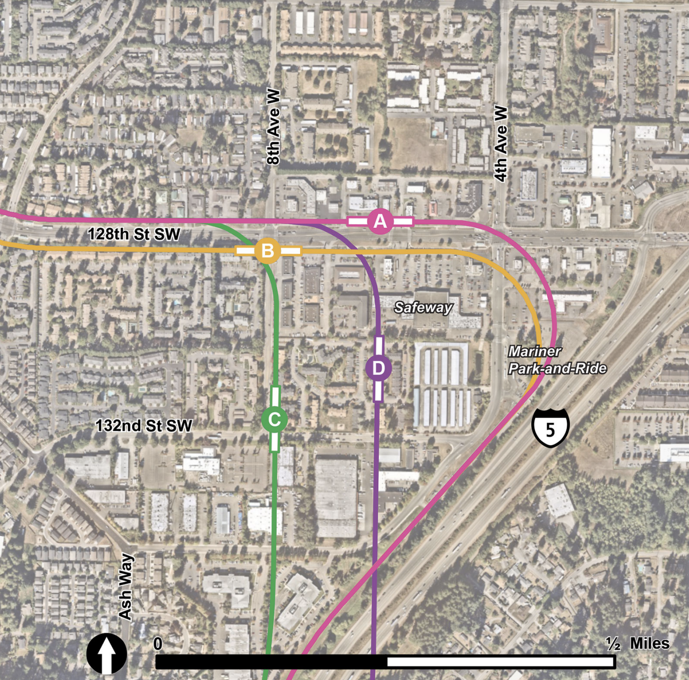 - At Ash Way, most commenters supported the ASH-D and ASH-A options. The east-of-I-5 ASH-D option decisively provides the most opportunity for transit-oriented development but could have cost issues since it would require crossing I-5 twice. Meanwhile, ASH-A is the best west-of-I-5 option.