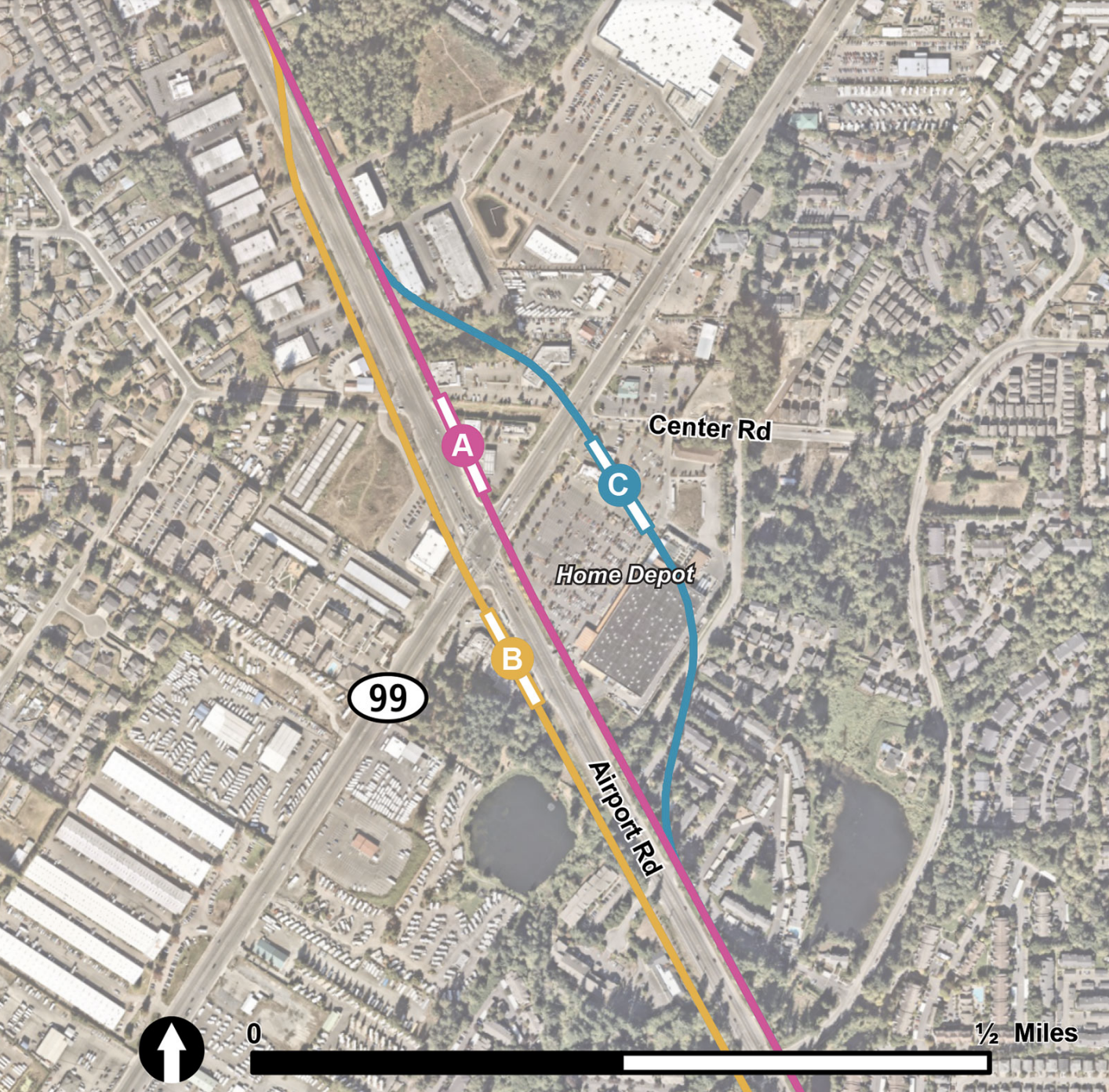 - At SR 99/Airport Road, most commenters supported the AIR-A and AIR-B options. The options are real tradeoffs with slightly fast service on the straighter AIR-A and AIR-B alignments and better bus connections whereas AIR-C might offer unique transit-oriented development potential given the area’s constraints. The AIR-A option also has the benefit of largely avoiding electric transmission lines over the AIR-B option.