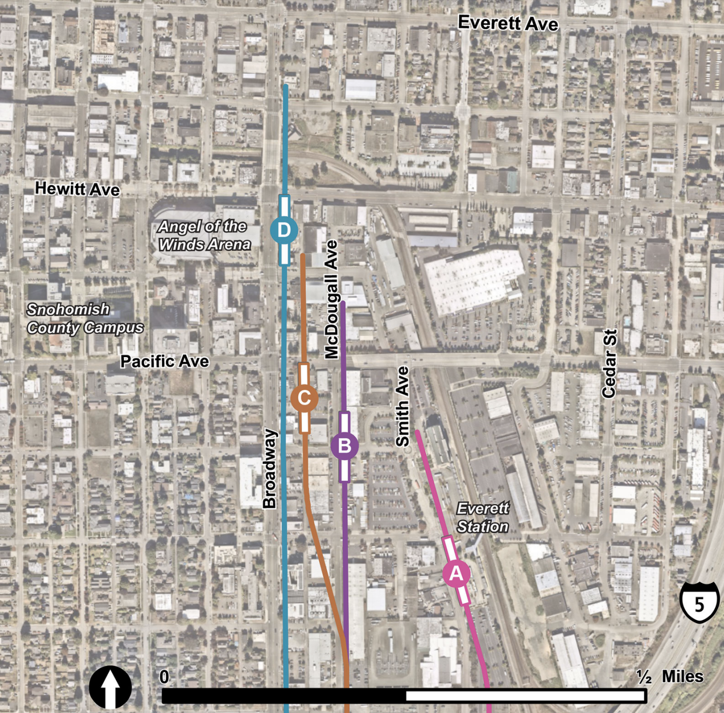 - At Everett Station, most commenters supported the EVT-A and EVT-C options. Both are predictable leaders, but come with real drawbacks. The EVT-A option would put a station where the existing Everett Station facilities are, forcing people to transfer to mediocre bus service to reach the city center and points north. The EVT-C option clumsily tries to thread the station and alignment via alleys, but would require a lot of property acquisitions and preclude some key transit-oriented development (this option would only be wise if it ran down alleys only starting at 39th Street). A better option may be something like EVT-B but with the station on Pacific Avenue.