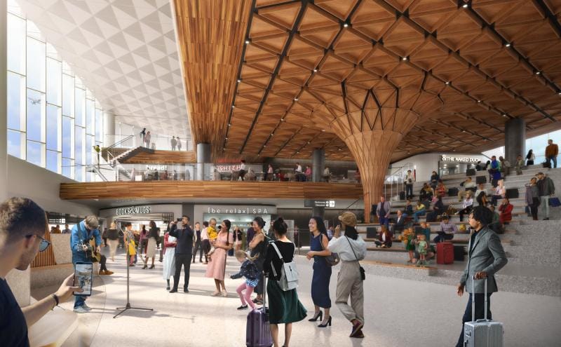 The Port of Seattle has unveiled new renderings for its C Concourse expansion project at Seattle-Tacoma International Airport (SEA). Design work for the expansion plans has reached the 30% completion benchmark and features a new seating, retail, and dining area. The expansion will add four floors to the existing building and blend the C and D Concourses together only a stone’s throw from the Central Terminal marketplace. A central feature of the expansion will be a grand staircase that functions as an ampitheater, which will offer space for people to sit, dine, people-watch, and enjoy live music. The Port wants this to be a welcoming gathering space that feels a lot like public markets.