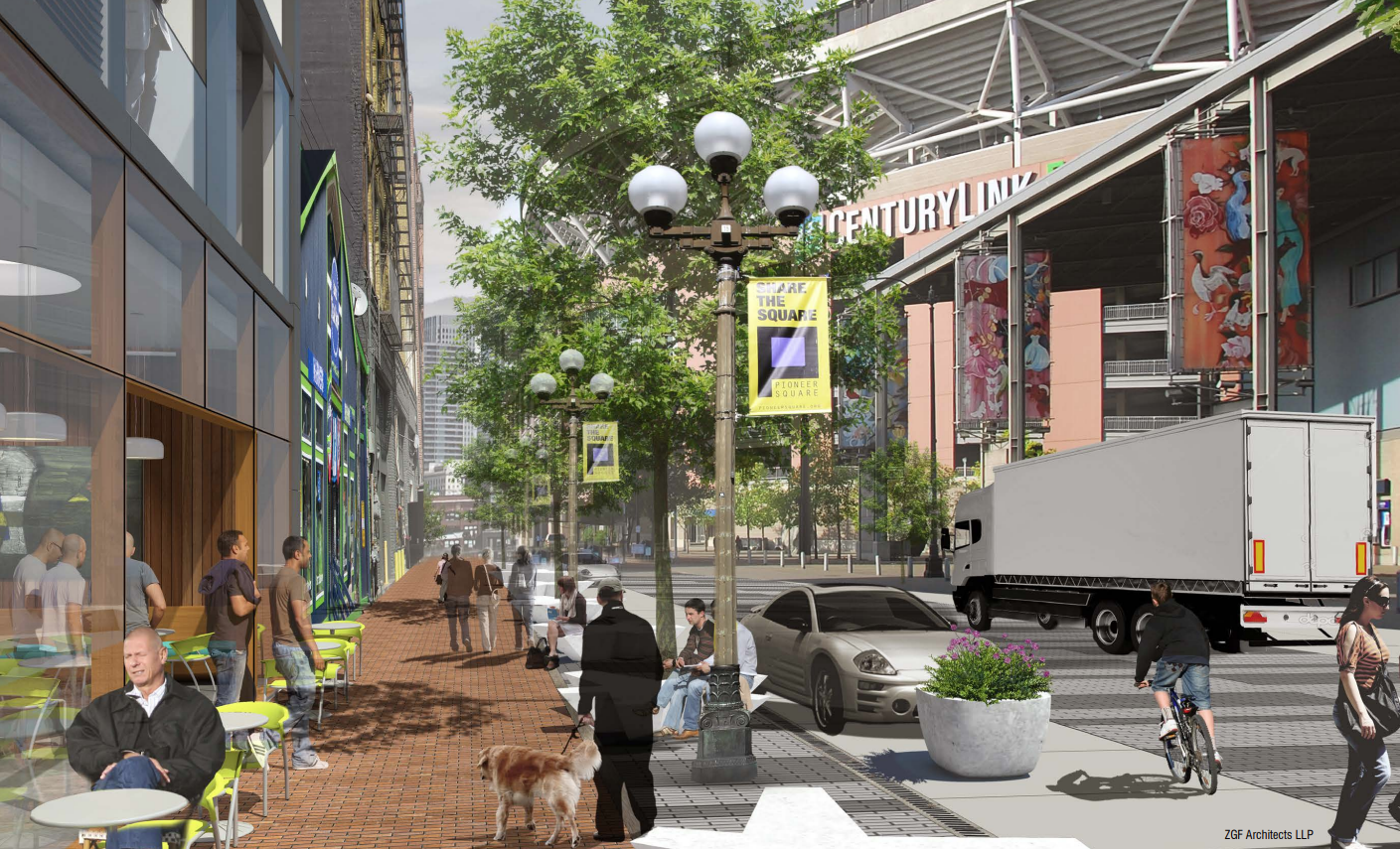 Along with the additional $26 million for pedestrian programs, $20 million would be added to fund transit improvement projects, with an additional $3 million intended to improve rider security and safety on the existing bus system. An additional $5 million would fund expanded pedestrian lighting throughout the city, and $6 million would fund work on a proposed “Occidental Promenade,” a project identified as part of work to create an improved neighborhood around Seattle’s sports stadiums. Like the nearby Railroad Way project, the Occidental Promenade would be open to vehicle traffic outside event days but closed like a festival street at times of high use.