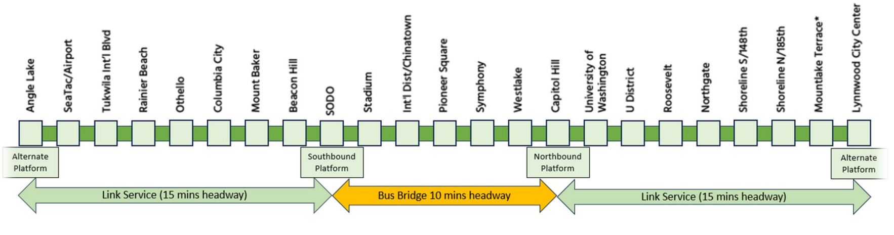 A bus bridge will connect University District, UW, and Capitol Hill stations during this closure, though Route 70 will be a good choice for many riders. Light rail trains on the north segment will run every 12 minutes, but only every 15 minutes between Capitol Hill and Angle Lake, undoubtedly leading to crowding particularly through downtown.