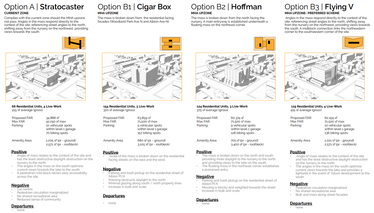 Hybrid Architecture’s preferred scheme is a “Flying V” design could add some visual interest to the block while also allowing more light to the north where Urban Earth nursery sits–potentially defusing a landmine for the project.