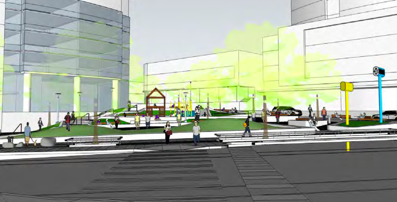 Situated at the cross section of Lenora Street and Westlake Avenue in the heart of the Denny Triangle Urban Center Village, The Urban Triangle Park will contribute an open lawn and play structure to an area of the city that has been criticized for its lack of amenities for families with children. Parents For a Better Downtown Seattle led the effort to bring local families together to participate in public outreach events held by the city and landscape architects.