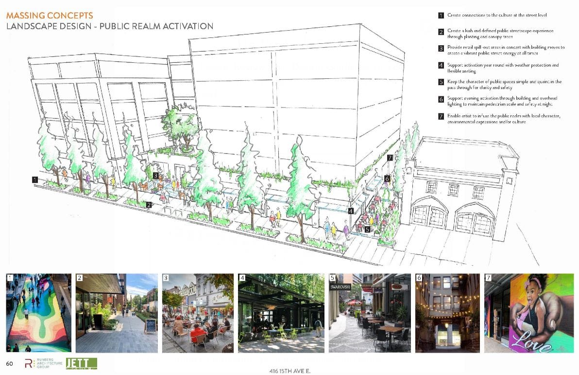 Johnson envisions a pedestrian-focused and “people-first” development, and mock-ups from the developer show young people eating and socializing. But the chaos of pedestrians entering retail or apartments from 35th Avenue NE while motorists simultaneously enter the surface parking lot could disrupt that atmosphere. Can a parking lot ever truly be a “shared use public plaza”?