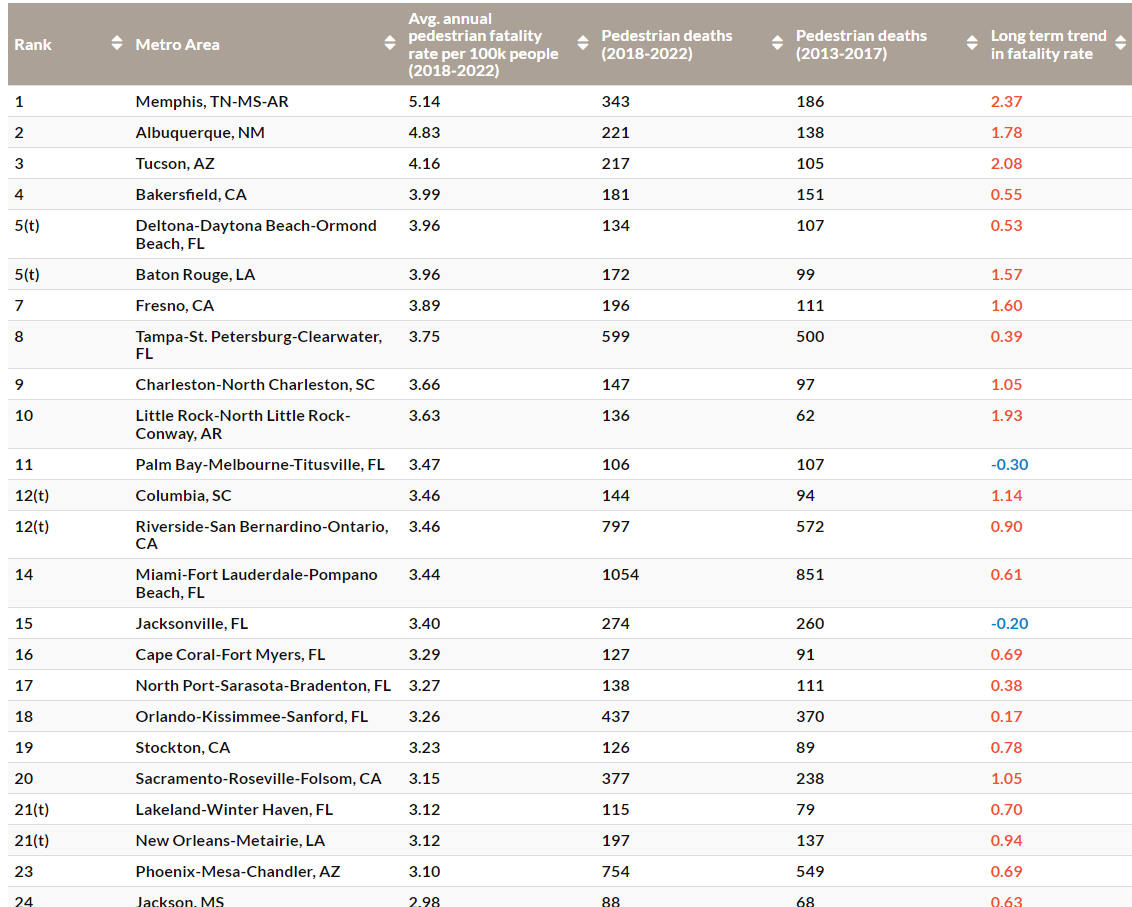 Serious injuries have spiked as well – between 2021 and 2023, the Centers for Disease Control (CDC) documented 137,325 emergency room visits for pedestrian injuries. Data shows that traffic violence is highest in the South and West, with metros like Memphis, Albuquerque, Tucson, and Bakersfield, Calif. topping the list.