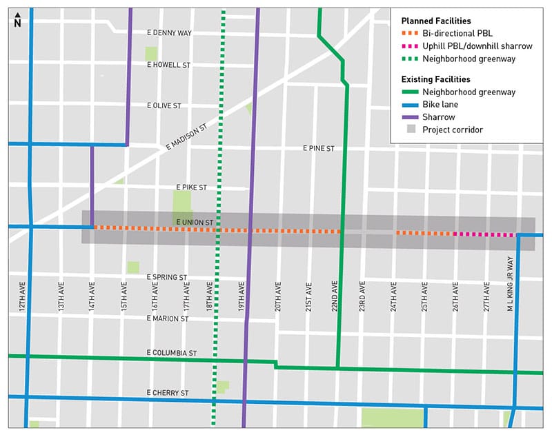The Seattle Department of Transportation’s new implementation plan has shown protected bike lane on E Union Street running from 13th Avenue in Capitol Hill all the way to Martin Luther King Jr Way in the Central District. However, SDOT has released its initial proposal for the eastern segment (picking up where the Madison Rapidride project leaves off on the Central District side) and it seems to fly in the face of everything that the department has been touting about its implementation plan creating full connections and all-ages-and-abilities facilities. The proposal includes a two block gap right in the middle of the corridor, on either side of busy 23rd Avenue, and doesn’t connect at all in the eastbound direction to MLK Jr Way.