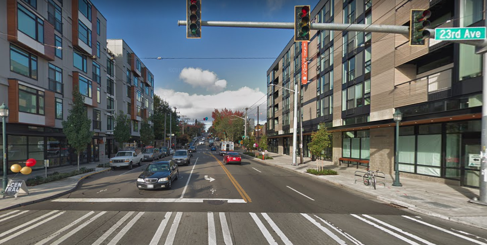 To fit a PBL through this section, we’d need to remove a vehicle travel lane in each direction. Condensing vehicles into a single lane would not only create slow downs for vehicles, it would also create a safety concern for pedestrians. Our traffic data shows a heavy amount of right turns at the 23rd Ave and Union St intersection, which means that removing a vehicle lane would increase the vehicle and pedestrian conflict.