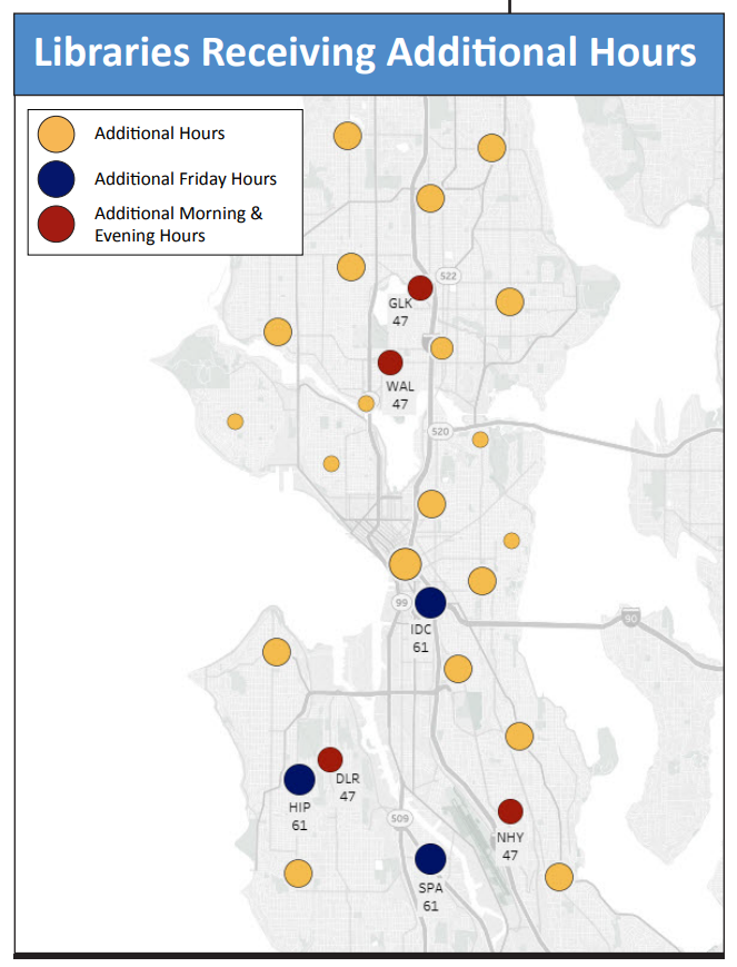In addition, several branches have abbreviated hours compared to larger ones: South Park, International District, and High Point would see additional morning hours (some days those branches open at 1pm) and evening hours (some days they close at 6pm).