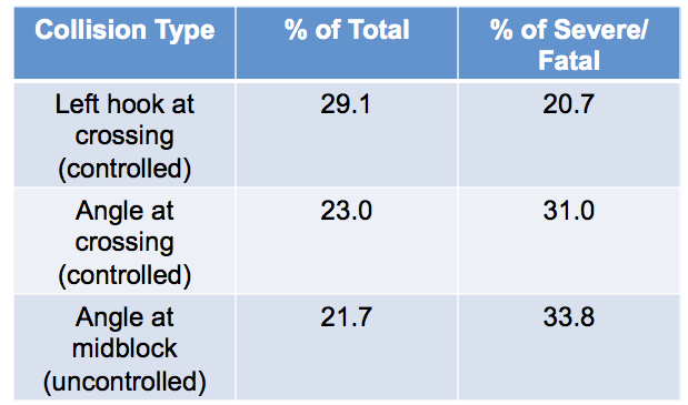 The pedestrian collision data showed that close to a third of pedestrian collisions were left hook collisions at controlled intersections, but the top type of serious and fatal collisions was one occurring at a mid-block crossing, likely because drivers are traveling at a higher speed and do not expect someone to be crossing. In other words, most pedestrian collisions are likely not “jaywalking”-related but many serious and fatal ones may be.