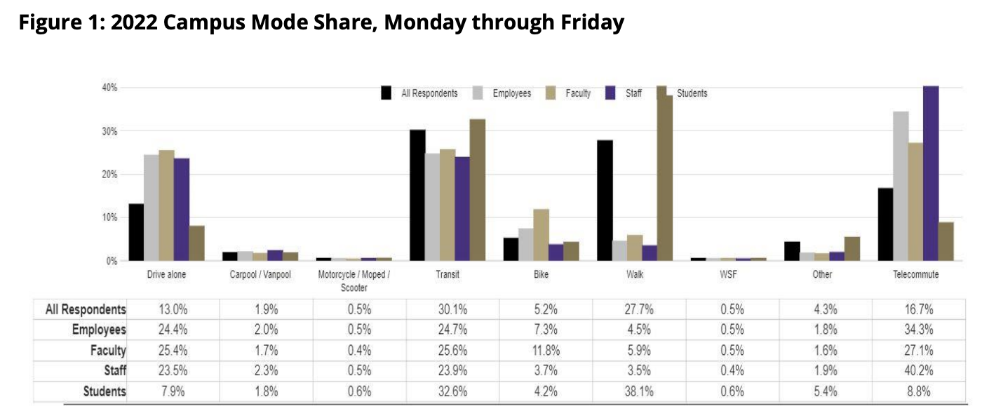 In its 2023 annual report, UW reported a 13% drive alone rate for 2022 across its whole population, with walking and transit the top two ways people get to campus. About a quarter of faculty and staff drive alone, but just 8% of students do, bringing down the campus-wide average. One big change in the pandemic era: 34% of UW employees are now telecommuting which has helped decrease driving rates and student transit rates are recovering after an initial pandemic dip.
