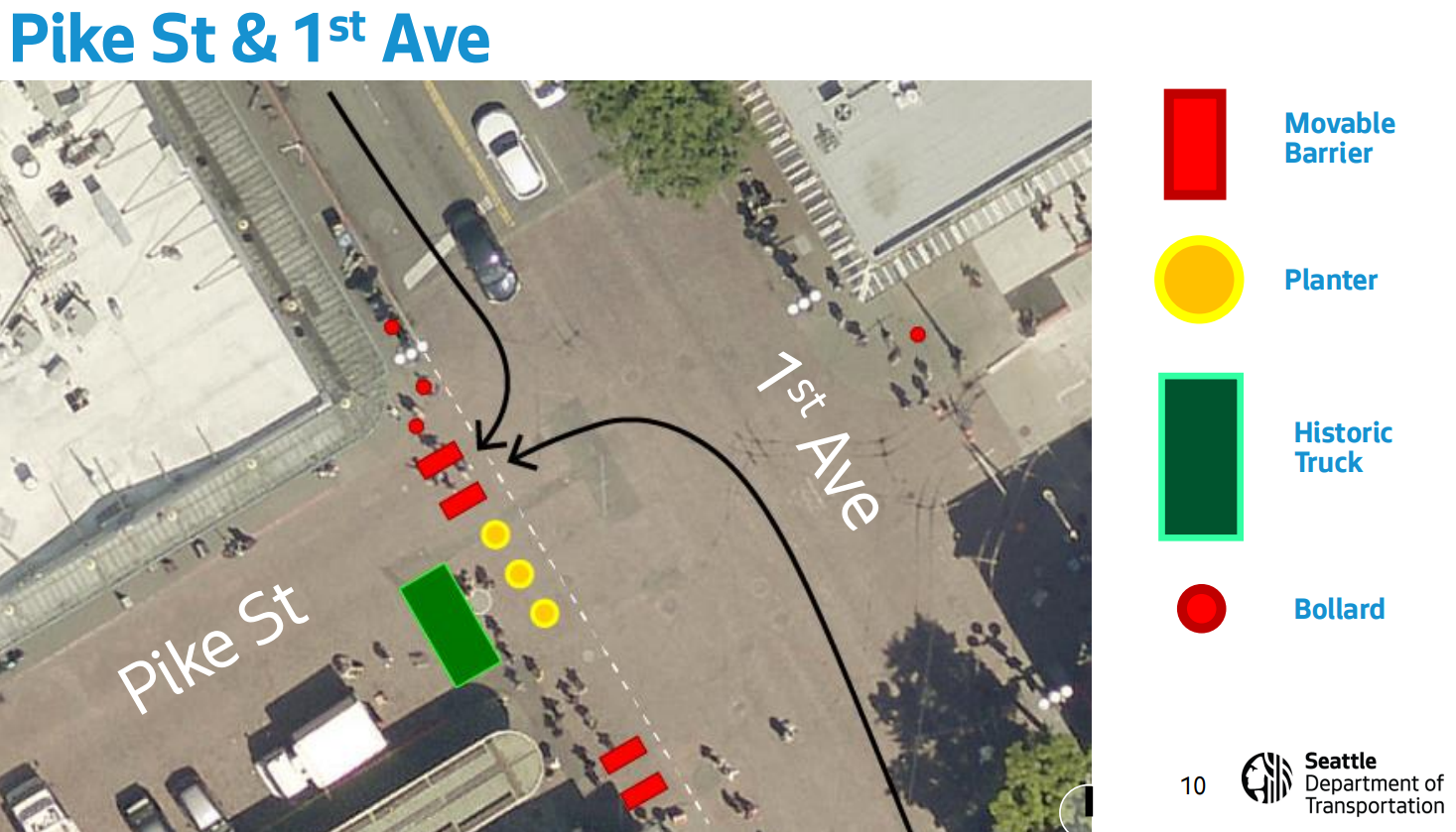 The plan presented Wednesday leans heavily on planters to block off non-essential vehicle access points, fitting in well with the Market atmosphere. Fire and delivery access lanes would be blocked off with barricades that could be more quickly removed: crash rated vehicle barriers like the type that were used to cordon off streets for this week’s Seahawks Super Bowl parade.