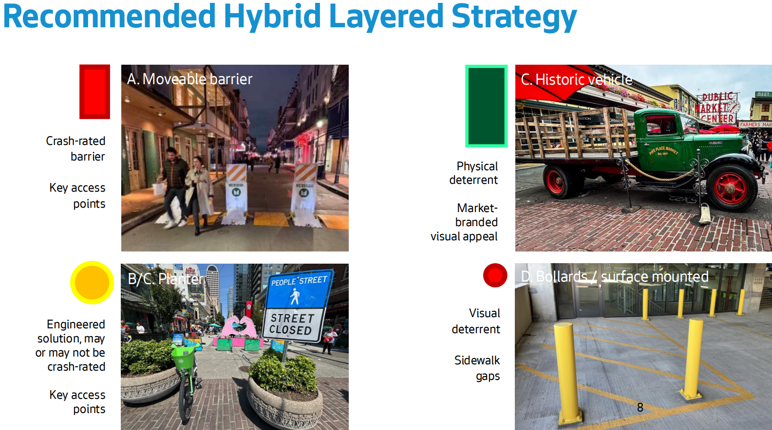 “Part of that is the dance between what is a long term solution and what we could accomplish this year,” SDOT’s Matt Beaulieu told the Commission. “In preparation for World Cup, we can’t physically construct retractable bollards in time for World Cup. When our time period moves out, they become feasible.”