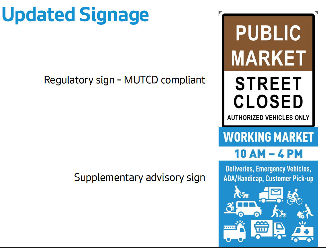 Another point of contention Wednesday was the signage SDOT plans to install at Market entrances, specifically the need to add “street closed” language to prohibit general purpose vehicles from entering. Despite the fact that Pike Place is one of the few places in Seattle where city code explicitly allows pedestrians to cross anywhere without falling under “jaywalking statutes”, that fact remains in conflict with state law, hence this proposed signage that allows the street to open for broader uses.