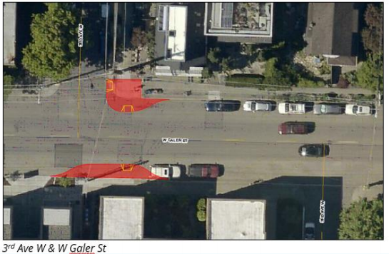 - Adding curb bulbs at 3rd Ave W and W Galer Street (but no marked crosswalk), marking crosswalks at 6th Ave W and W Crockett Street, and Queen Anne Ave N and W Howe Street.