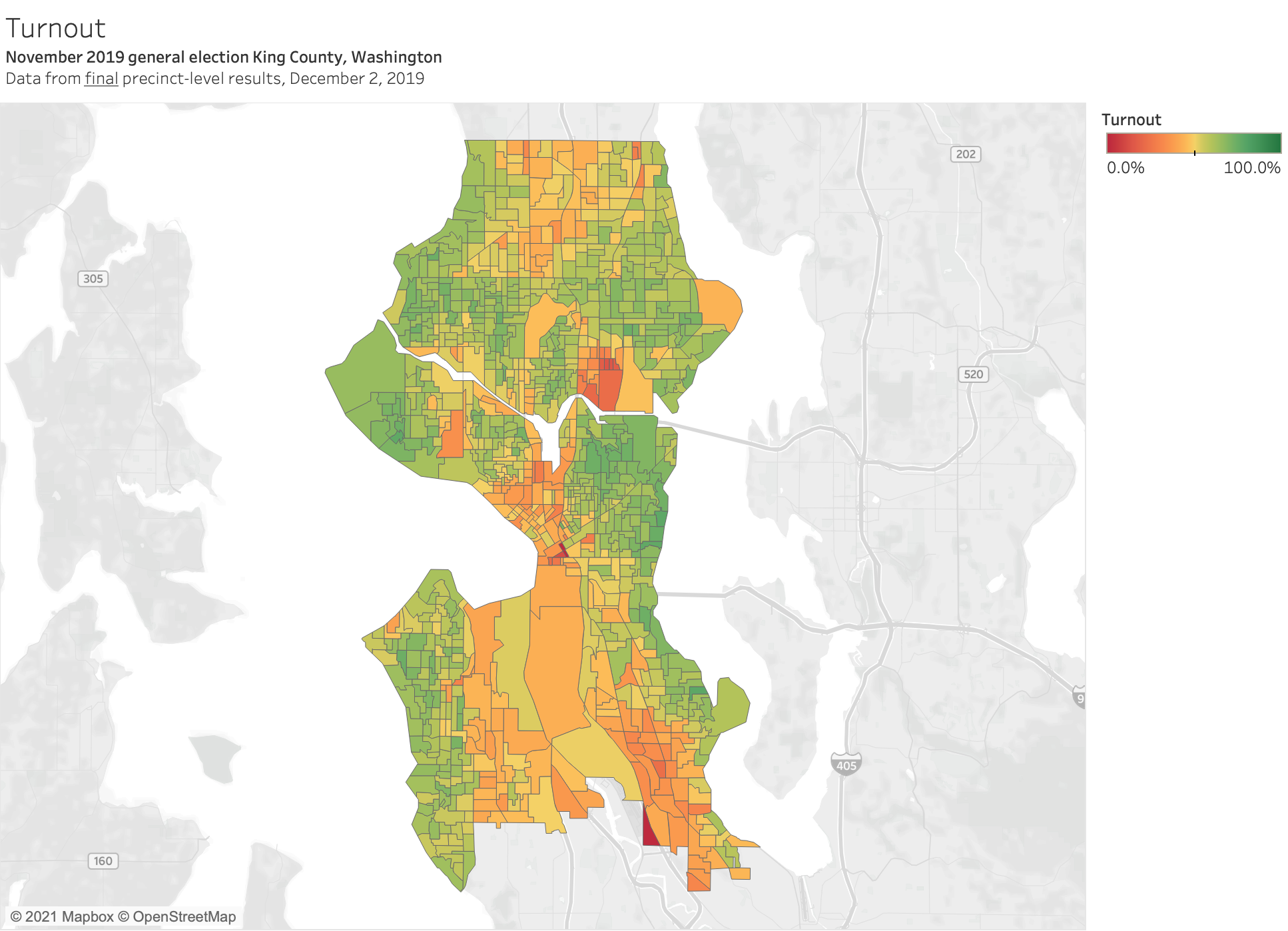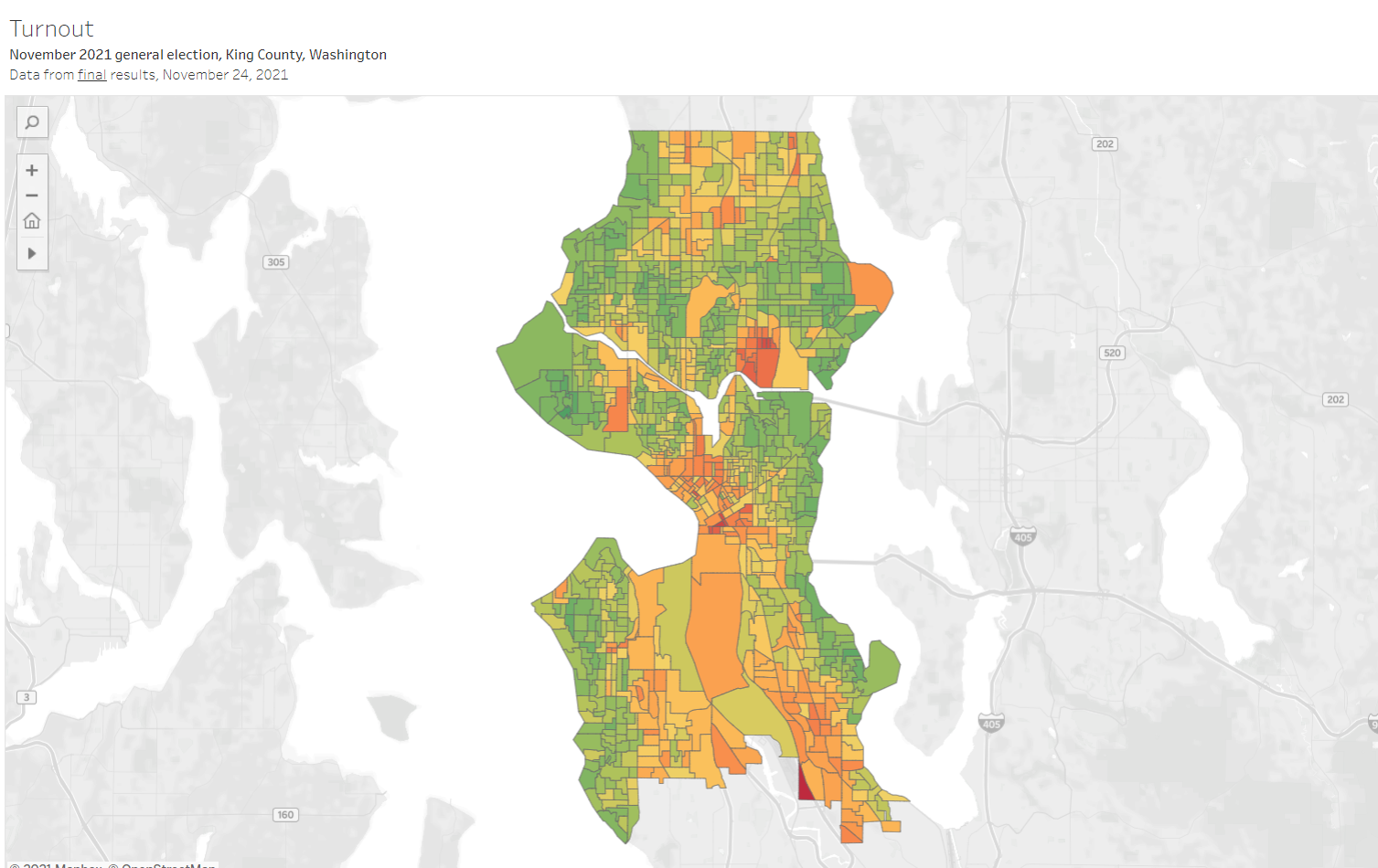 Looking farther back at 2017, when former prosecutor Jenny Durkan beat urbanist Cary Moon by 13 points, turnout was softer across the board. The green bands along the water were a lighter shade, but because the urban core of the city was still largely orange with low turnout, it still equaled out to a rout of the urbanist/progressive mayoral candidate. (See the interactive map here.)