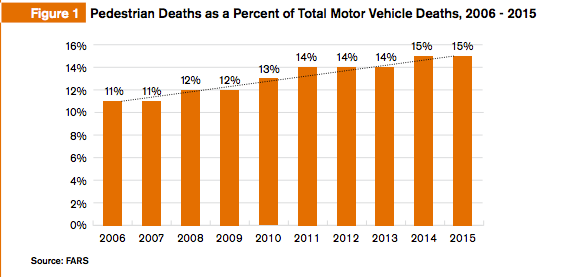 As cars become safer and safer, as technology that helps drivers behind the wheel improves, the burden when the systems we’ve designed fail falls on vulnerable users–pedestrians and cyclists. One statistic that is sure to keep going up is the share of motor vehicles deaths that are pedestrians. From 2006 to 2015, as the chart below shows, that share went from 11% to 15%.