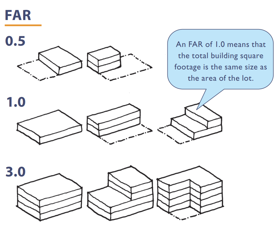 Under the bill, the requirement to allow density is determined by a measurement known as floor area ratio (FAR), which is how much floor space a building can take up on a lot. The higher the FAR, the more development is allowed. A one-story building taking up an entire lot has a FAR of 1, and a four story building taking up exactly half of its lot has a FAR of 2.