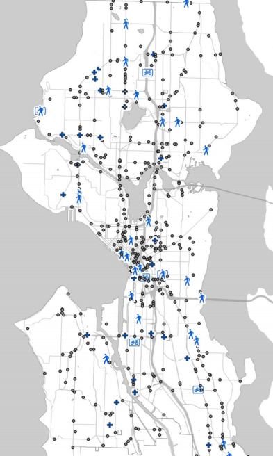 The map of where people are getting hurt on Seattle’s streets also highlights how much of a hotspot WSDOT-controlled Aurora Avenue is. Just last night, another pedestrian was seriously injured on that street near a crossing at Green Lake, and just last month a pedestrian was killed not far from there. WSDOT is repaving this stretch of State Route 99, but safety improvements getting added at the same time? Not so much.