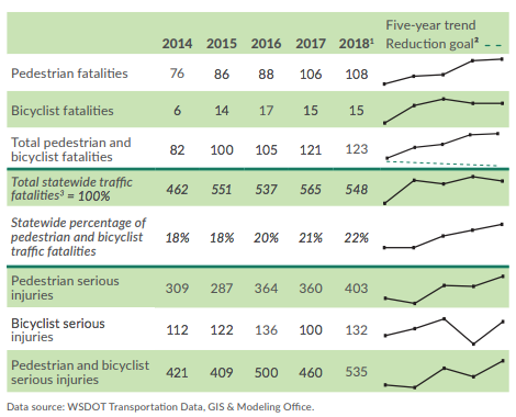 The idea to allocate funding proportionally based on who’s getting hurt by our current roadway designs came originally from safety advocate Don Kostalec. Statewide transportation spending has a very long way to go to catch up to the reality that so many fatalities is not something we need to accept. Washington State was one of the first states to adopt a goal of zero fatalities on our roads, back in 2000. But the numbers have gone in the exact opposite direction.