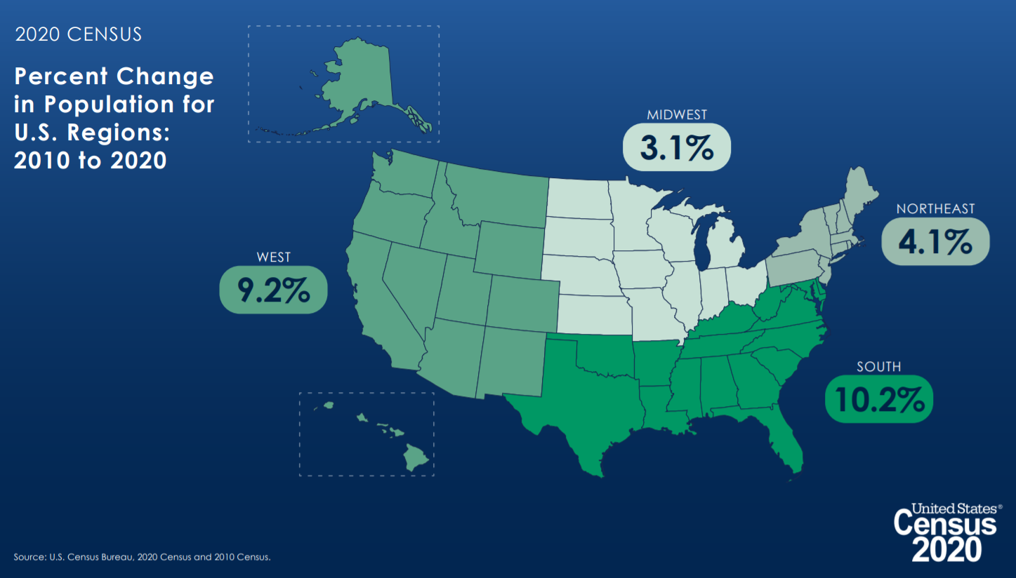 Overall, the South and West regions led the nation’s growth, with 10.2% and 9.2% growth respectively. The Midwest grew the slowest with just 3.1% growth over the decade.