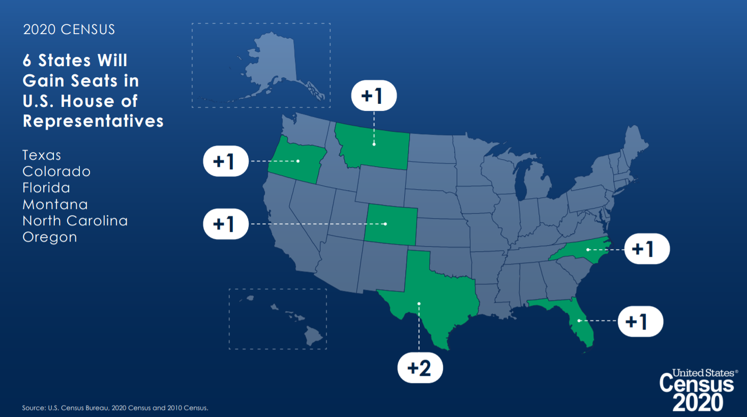 States that gained seats in Congress (and thus also the Electoral College) include Texas with two, and Oregon, Montana, Colorado, North Carolina, and Florida each gained one seat, as illustrated below. Prognosticators had expected Arizona to gain a seat and Texas and Florida to each gain one more seat than they did, but that didn’t come to pass.