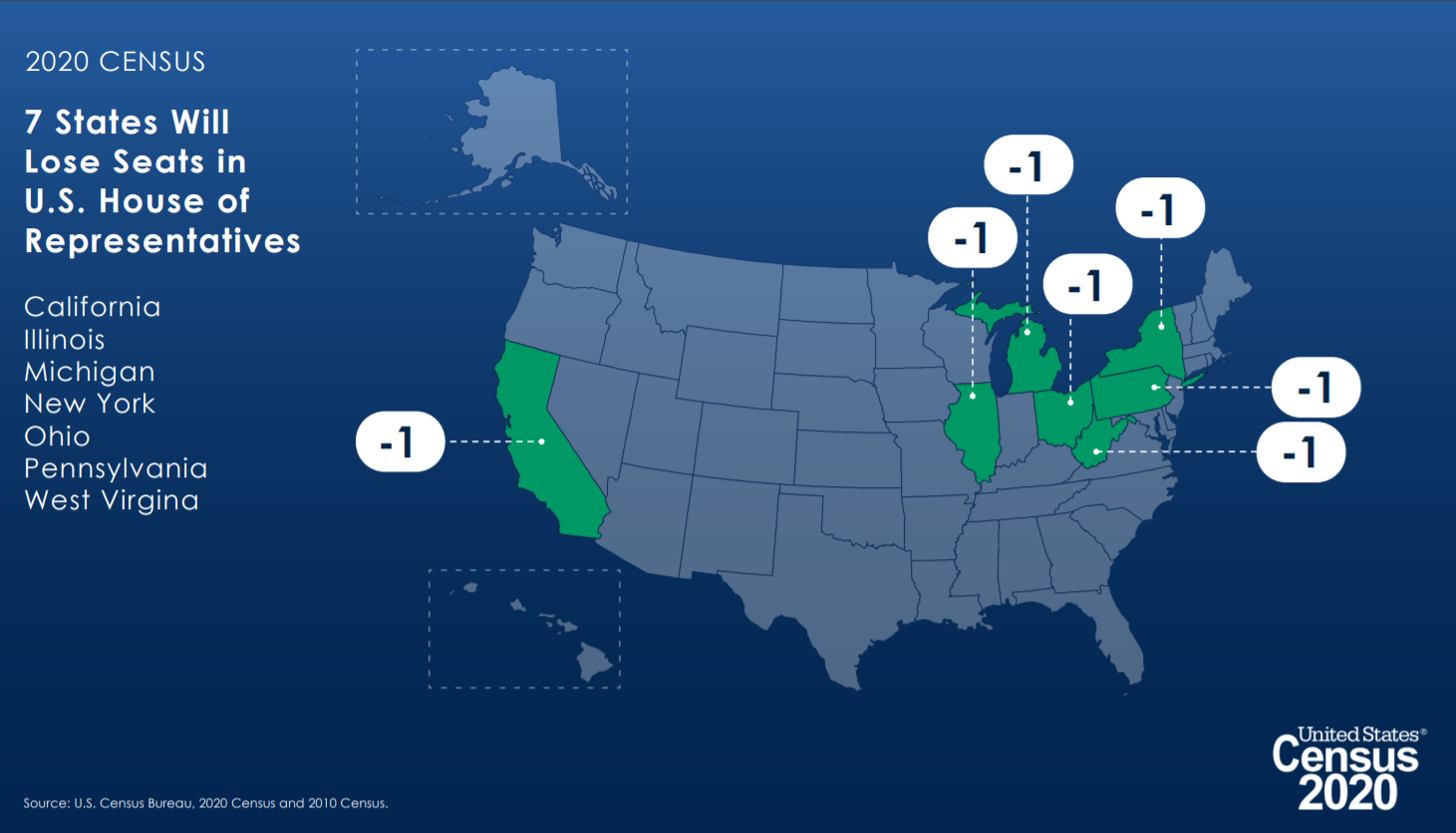 Fewer states gaining, meant the “on the bubble” states of Alabama, Rhode Island, Minnesota held on to keep their allotment of seats. The states that lost a seat are shown below. Most of them are in the Rust Belt or Northeast. New York, by the way, was just 89 residents short of keeping its seat.