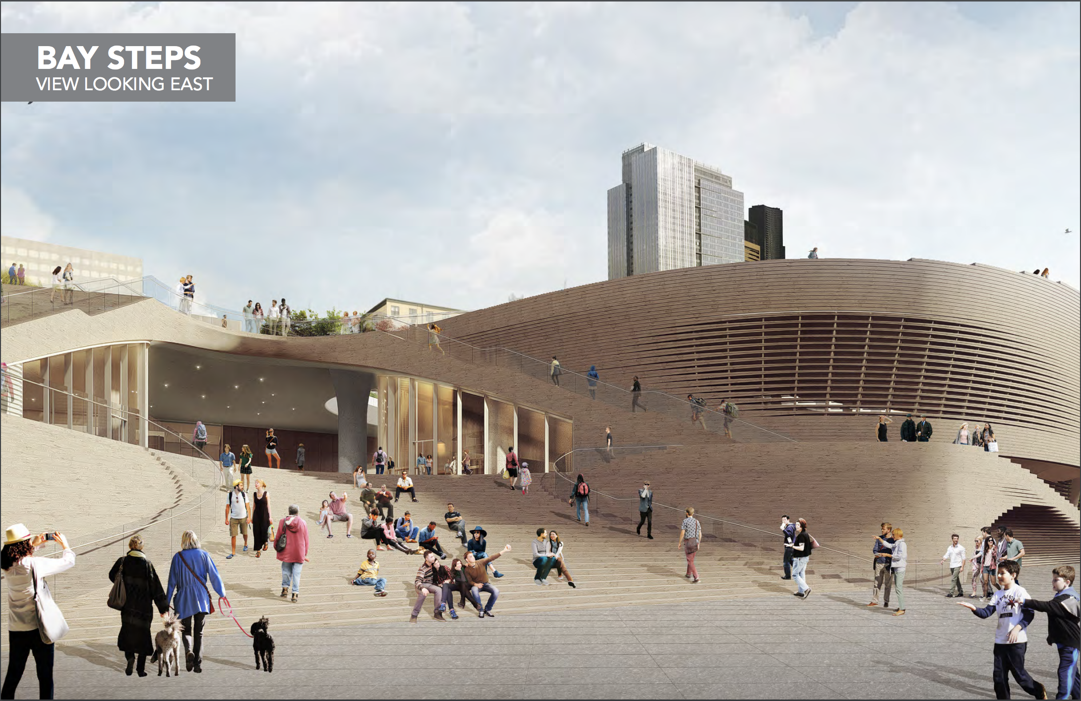 The concept shows several main elements including the upper Bluff Walk near the market, the Bridge over the new waterfront boulevard, and the Ocean Pavilion and new plaza at the waterfront. They are all woven together by the cascading walkway punctuated by a series of moments–places to hang out, sit and play, and enjoy that we live near beautiful open water and the view that provides us.