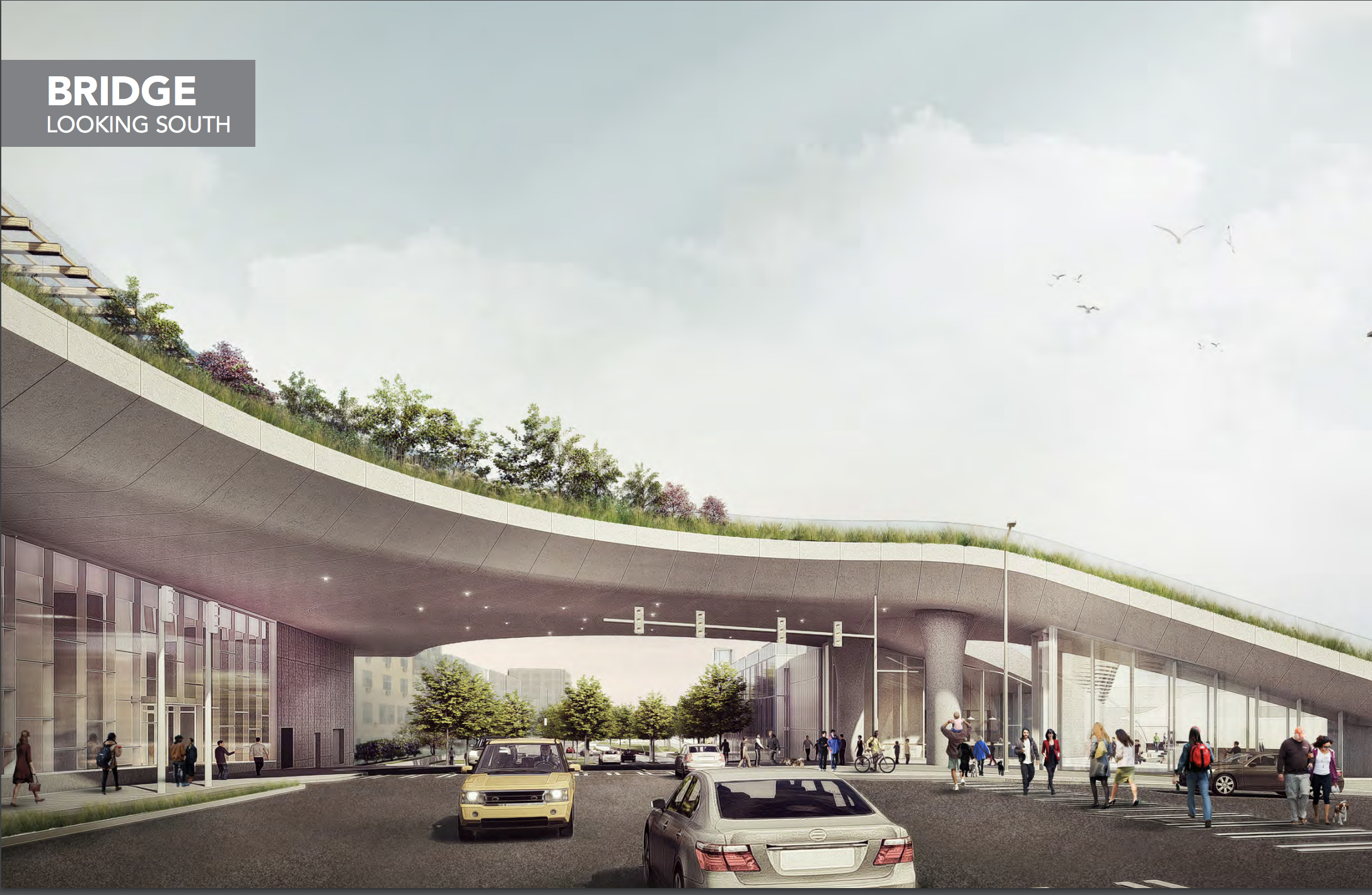 The walk will create a land bridge over the waterfront boulevard. Some urbanists are concerned that what was originally promised to be a more pedestrian and connected waterfront will still be walled off by a new multi-lane street full of buses and trucks. Activists are working to ensure this does not happen, but if the new arterial is as bad as some fear, the bridge will enable a direct and car free connection between the market and the waterfront. The rendering also show it as more of a heavily vegetated land bridge or aerial park like The Highline in Manhattan than a utilitarian pedestrian bridge.