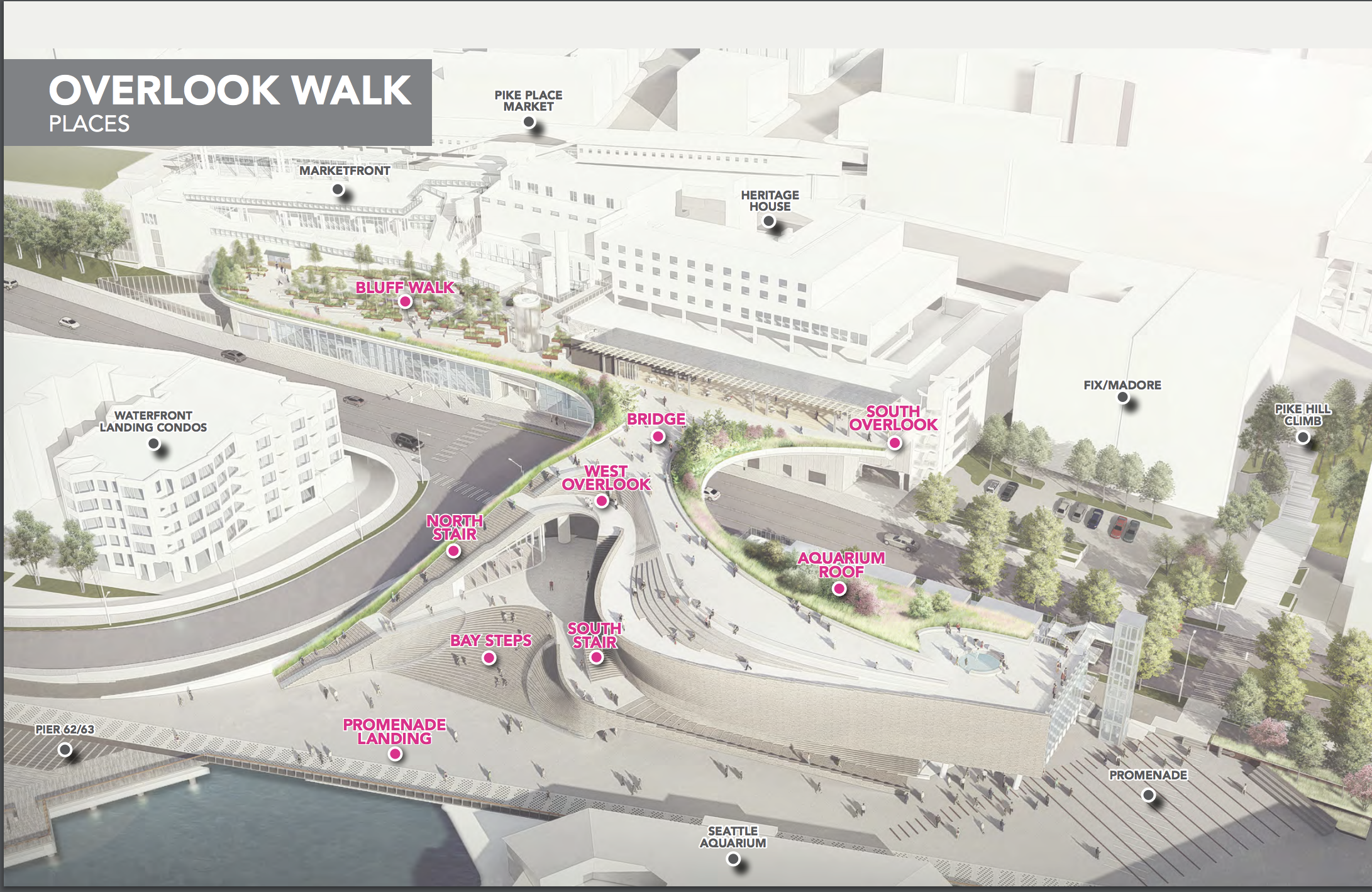 On April 19th the proposed design for the new Overlook Walk and Seattle Aquarium Ocean Pavilion went before the Design Commission and was approved with one condition and several recommendations. The Overlook Walk is described as ” a signature element” for the redesign of the waterfront and will be composed of “a series of walkways, stairs, plazas, and overlooks that provide a key connection between the waterfront and Pike Place Market.” The project also includes two buildings, one of which, the Market Front building is already built.