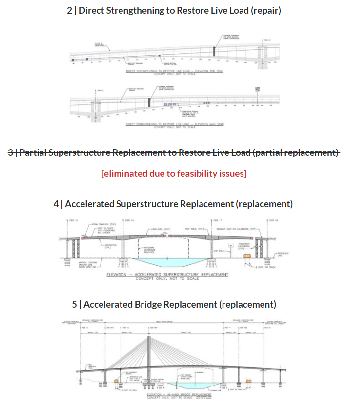 As reported in July, this analysis goes over six options for the West Seattle High-Rise Bridge Safety Project. Options for further evaluation was reduced to five after alternative 3 (partial superstructure replacement) was eliminated due to it being prohibitively difficult. This leaves alternative 2 also known as direct strengthening as the sole repair option. Full superstructure replacement, bridge replacement, and immersed tube tunnel, alternatives 4 through 6 respectively, remain as replacement options. Note that option 1 or shoring is effectively a replacement option as it would only give SDOT five years of lifespan to plan for a replacement.