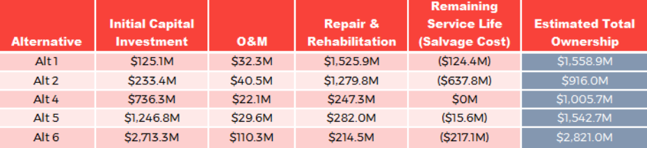 To calculate life cycle costs, WSP first added up ROM capital costs, inspection, operating, and maintenance costs, future repair and rehabilitation costs. Then they subtracted salvage costs, the fraction of capital costs based on remaining years of services at the end of the 2021-2100 life cycle cost assessment. For alternatives 1 and 2, WSP assumes and factors in cost of full replacement at the end of those alternative’s life cycles. That eventual construction cost is factored into the repair and rehabilitation column.