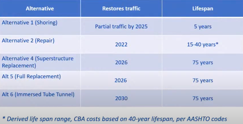 After lifecycle is calculated, repair and full superstructure replacement come out with similar cost estimates, around a billion dollars between 2021-2100, easily within each other’s margins of error. Shoring that will require a full bridge replacement and just a full bridge replacement come out to similar costs, a billion and a half dollars. As expected, the tunnel comes out to the most expensive option with a price tag around $3 billion.