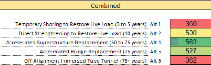With every alternative rated, alternative 2, 4, and 5 stand out as the most compelling options for performance with each taking top performances in a multiple performance attributes. On the most important issues of mobility impacts and seismic/safety, repair and replace each take one. Even before factoring in the possibility a three-year “rapid replace” timeline in alternative 4’s ratings, superstructure replacement performs the best with full replacement and then repair following close by.