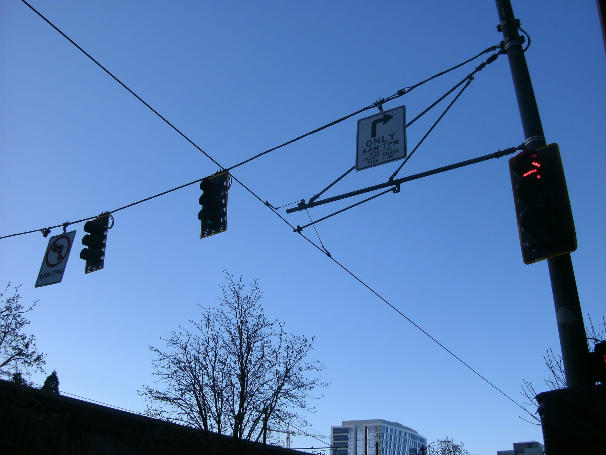 - The signage chosen has proven ineffective in other areas. SDOT passed over the more successful treatment on 3rd Avenue, where travel during the peak is restricted to one block and where there are large DO NOT ENTER signs directly above the roadway where cars are prohibited from continuing through the intersection. Instead, SDOT has chosen the same signage that they have previously chosen on Bell Street to restrict through travel — these are infamously ignored. SDOT does appear to have additional signage on Westlake ready to unveil with the service change, but it’s clear that side-of-the-road signage is not going to be as effective as red lanes or DO NOT ENTER signs over the roadway like on 3rd.
