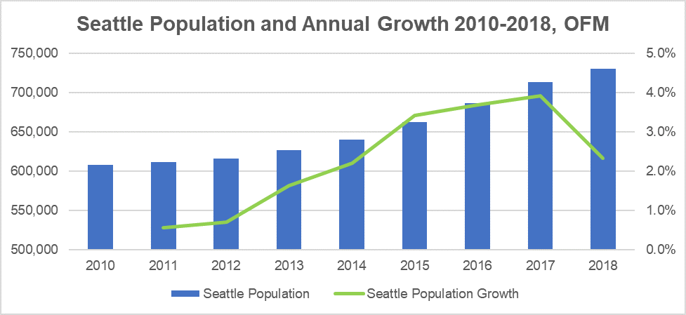 Washington State’s Office of Financial Management (OFM) publishes population estimates for April first of each year at the end of June, a much faster turn-around than the Census’ annual population updates. The April population estimate, by allowing us to compare the Seattle population of April 2017 to April 2018, gives us a view, for the first time, of the demand driving Seattle rents for the first part of this year.