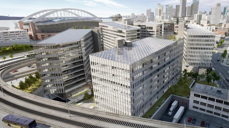 Collectively dubbed “S-Campus,” the development would add 1.25 million square feet of Class A office or laboratory space spread out in six shiny buildings on a nearly seven-acre campus. Valued at over $600 million, none of the planned developments would comport with conceptual headhouses that Sound Transit has sketched out for preferred station entrances. Urban Visions has been working on proposals for that site since 2014 and appeared close to breaking ground in 2020. And then the pandemic happened, office demand tanked, construction costs spiked, and the project was paused.