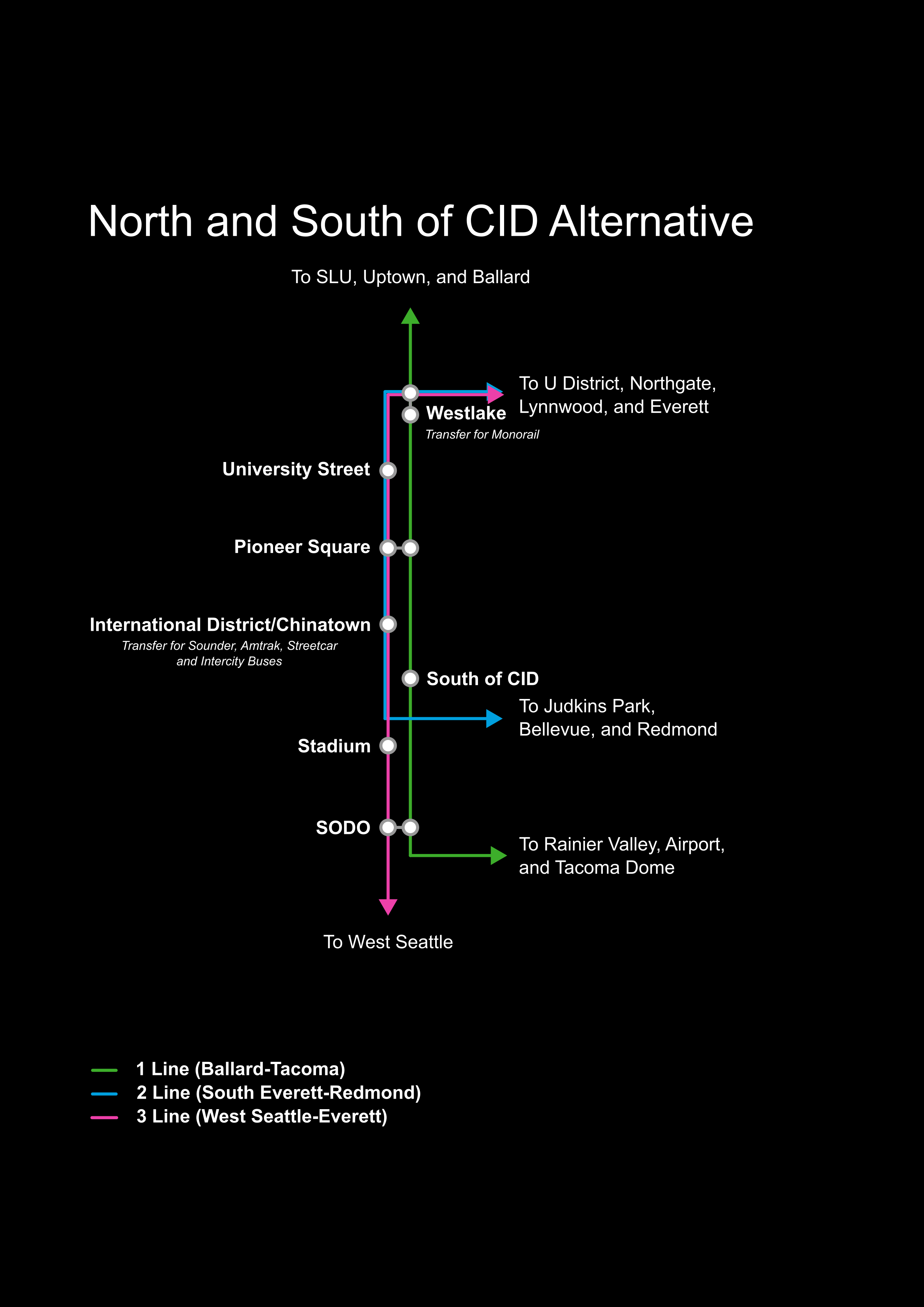 The 4th Avenue options place the station at Union Station, on the opposite side of the building from the existing Chinatown-International District Station. It pairs with a new downtown tunnel and a Midtown Station at approximately 4th Avenue and Madison Street across from the Central Library. In the alternatives, the South of CID station will be on the large site south of Seattle Boulevard and 6th Avenue, and the North of CID station will be at James Street and 4th Avenue, the site of the County Administration Building. In the proposed “North and South of CID” option, those two stations are paired together with a tunnel under the CID. In all cases, the North of CID station precludes the 4th Avenue and Midtown stations.