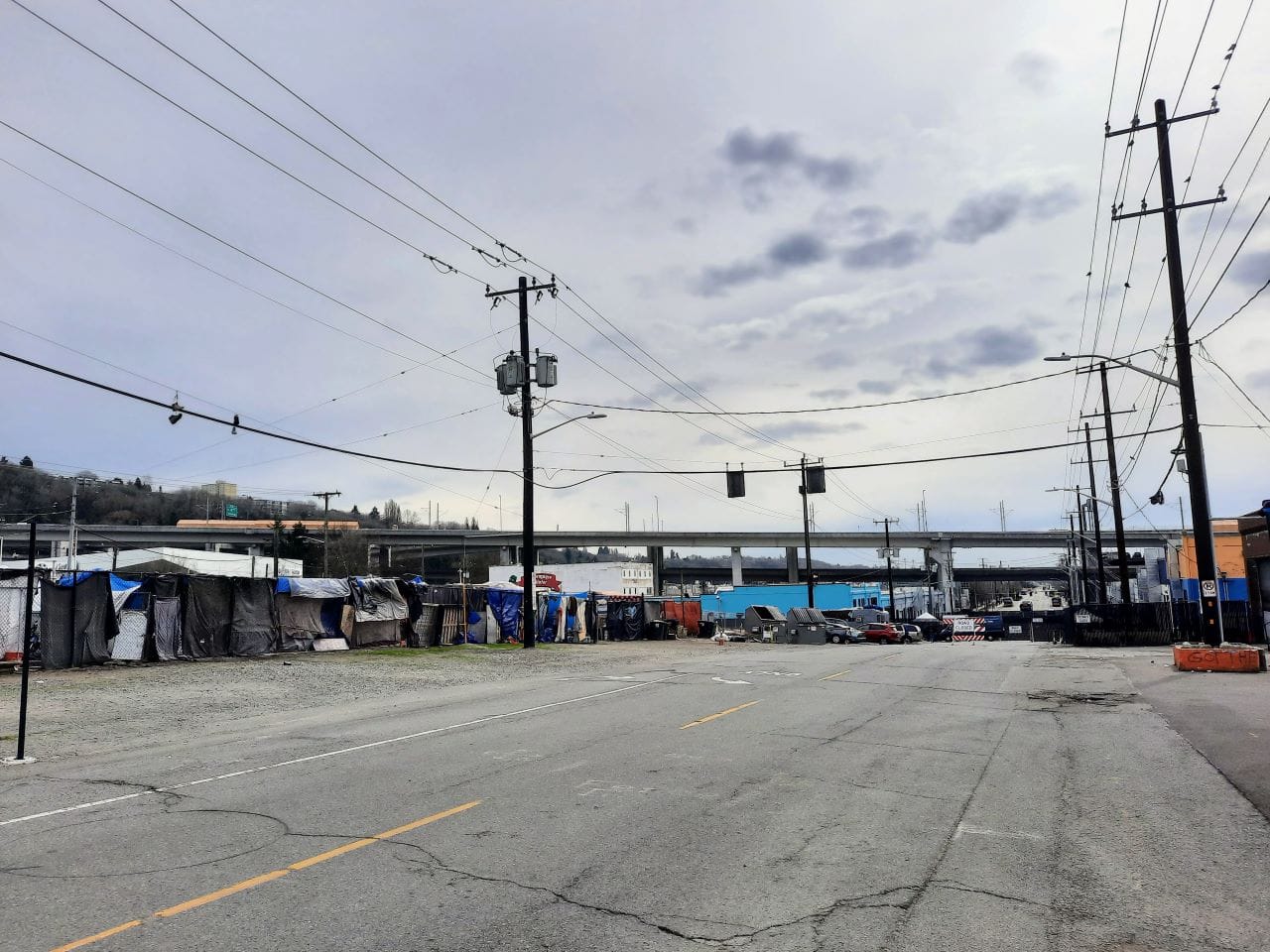 The fate of the area is uncertain. Right now, about a dozen buildings and a portion of 6th Avenue S serve as an emergency shelter site for about 400 people experiencing homelessness. Other than the Inscape Arts and Cultural Center to the northwest and a handful of buildings north of S Charles Street, the immediate area is full of surface parking and abandoned buildings. It is bounded by a web of I-90 and East Link flyover bridges and a BMW car dealership. Things might change though and that could affect how a station would be constructed and if equitable transit-oriented development could even be realized.