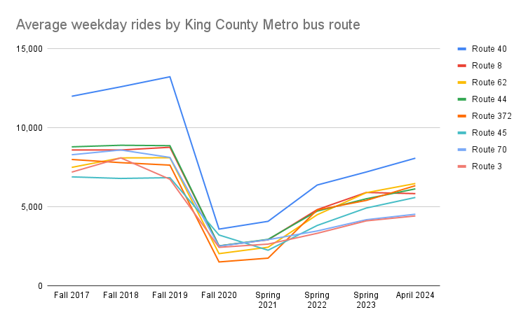 | Route | Fall 2017 | Fall 2018 | Fall 2019 | Fall 2020 | Spring 2021 | Spring 2022 | Spring 2023 | April 2024 | % of pre-pandemic |