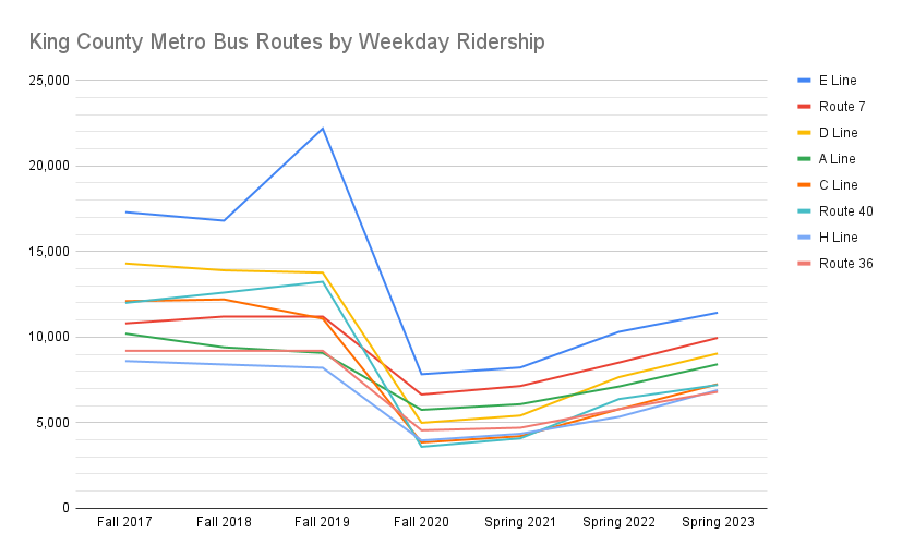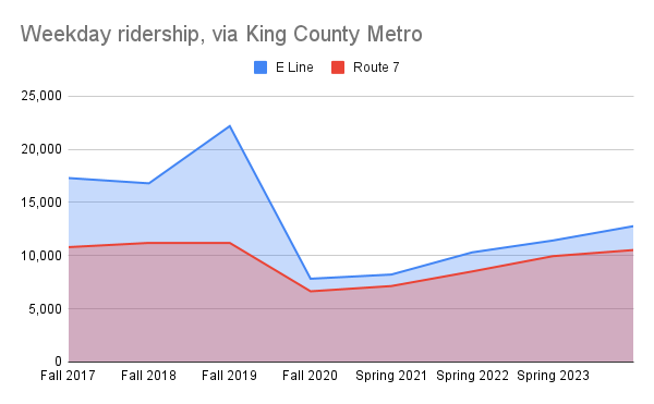 The E Line remains the highest ridership bus in the region, and its average weekday rides climbed to 12,779 in April and May of 2024, according to Metro. However, it still sits at 68% of its three-year pre-pandemic weekday ridership average. Due in part to construction impacts during the Alaskan Way Viaduct replacement project and a big boost in bus frequency to compensate, the E Line hit a record-high of 22,184 weekday rides in fall 2019.