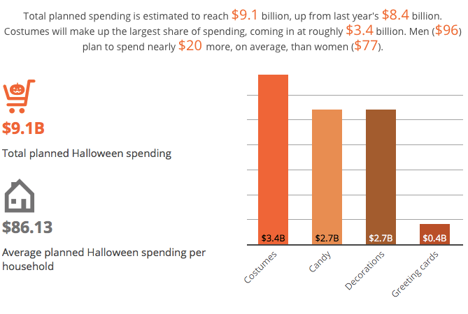 This has occurred even as the amount of spending on Halloween has continued to increase from $8.4 billion in 2016 to $9.1 billion in 2017. Current projections for 2018 put the spending at $9 billion again.