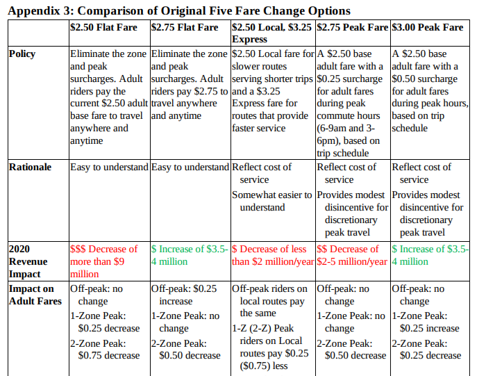 Meanwhile under a $2.75 flat fare scenario, Metro’s model showed ridership decreasing slightly. 2020 ridership would drop 0.3% over a no change scenario–which translates to annual ridership decrease of about 400,000.