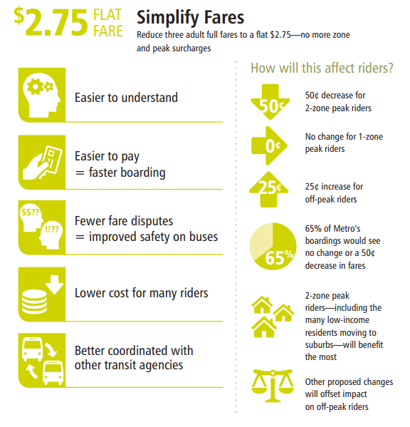 “Any proposed change to Metro’s fare structure must ensure that Metro’s farebox recovery remain above 25 percent. If a proposed change were to bring Metro’s farebox recovery under 25 percent, Metro might have to consider cutting service or delaying service adds as one way to reduce costs. A baseline forecast with no fare changes and current expenditures projects Metro’s farebox recovery ratio to be 25.9 percent by 2020. The $2.75 flat fare would increase net fare revenue by an estimated $3.5 million, or about 2.2 percent, by 2020. This would increase the farebox recovery ratio in 2020 by 0.5 percent, bringing it to 26.4 percent.”