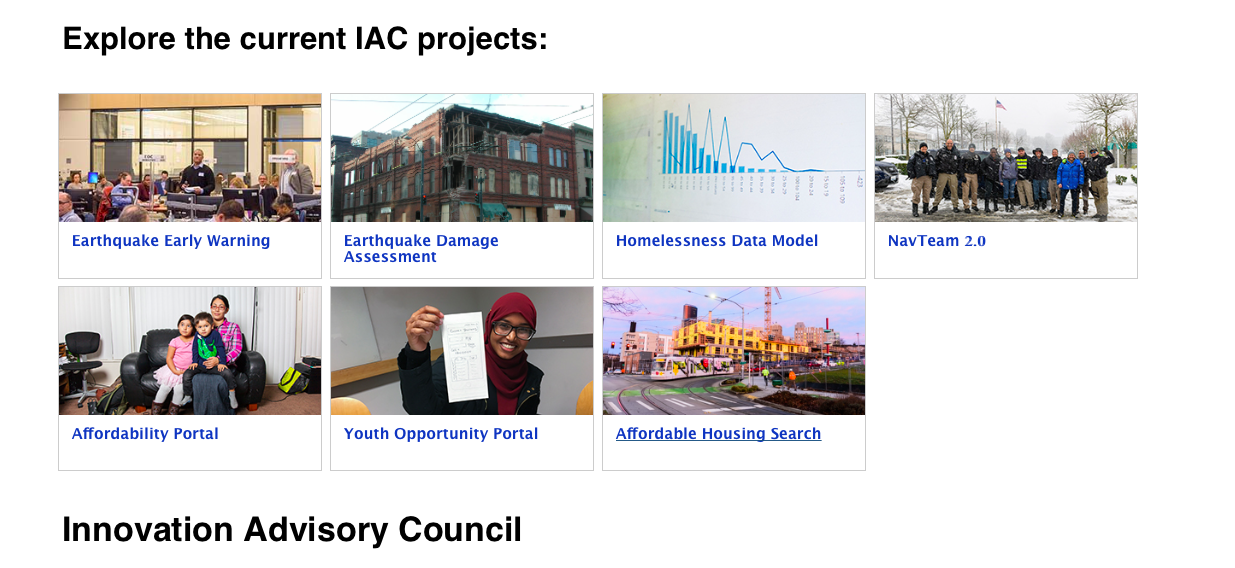 In the subsequent months, nearly 60 people from City of Seattle departments met with IAC members to determine how to best match city projects with IAC members’ skills. Using this information, seven “Phase 1” projects were identified, including:
