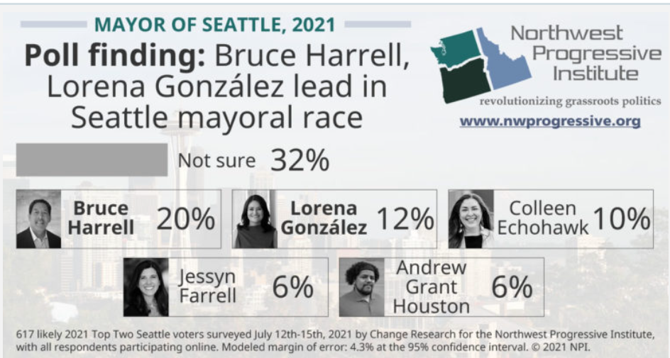 Even if his record on homelessness is pretty weak, Harrell’s year-and-a-half retirement from his three-term council career might be enough to wash a bit of the stink off him — perhaps decisively in a race with González. The Washington Research Group poll did head-to-head matchups between leading candidates and found Harrell up 65 to 35 in a matchup with González, but had him trailing Echohawk 51-49.