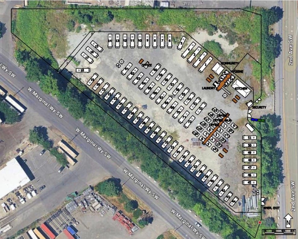 Sites for potential RV encampments and tiny home villages were identified within weeks of Wilson’s inauguration, with a state-owned parcel on W Marginal Way SW in West Seattle selected as the first to move forward. Glassyard Commons will be operated by the Low Income Housing Institute (LIHI) and will include space for 72 RVs and 20 tiny homes.