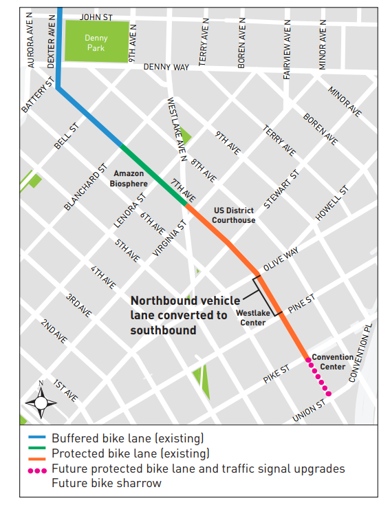 Along with a planned northbound protected bike lane on Eighth Avenue to follow, Seventh Avenue will provide connectivity along a gap in the network for people on bikes to get between Denny Triangle, South Lake Union, and points north. Facilities like the Westlake Cycletrack, the Dexter Avenue bike lanes, and the Mercer Street green lane all provide various levels of all ages and abilities routes in South Lake Union, but they aren’t connected, and routes to get downtown are still very limited.